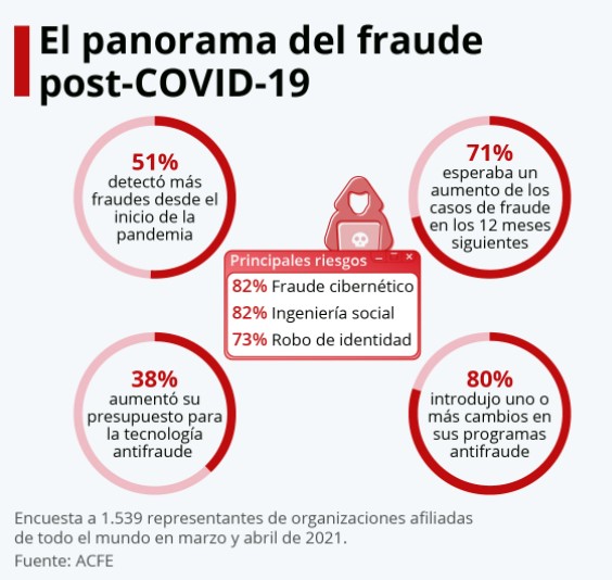 En una encuesta realizada por la ACFE se podría visualizar que el 51% de los encuestados había visto incrementar el fraude en sus organizaciones desde el inicio de la pandemia, y que los principales riesgos a los cuales estaba sometida una organización era el fraude cibernético, ingeniería social y robo de identidad.